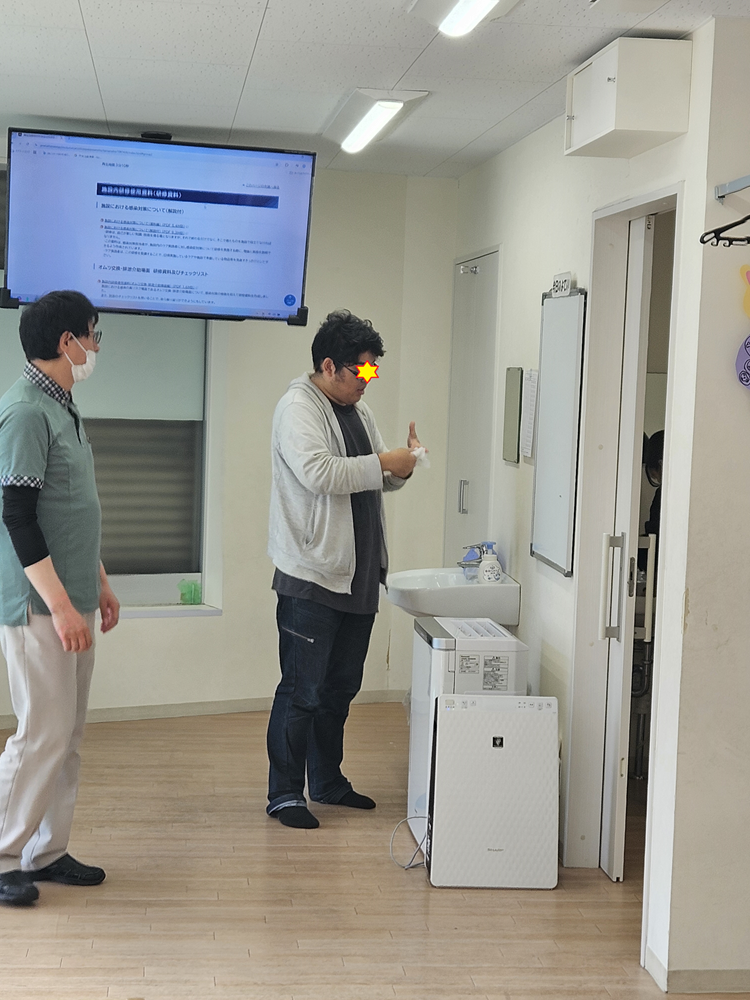 シミュレーションを行う事でスムーズに対処ができる様、スタッフ皆で座学から想定シミュレーションをしております。又、今回は普段利用者さんに活動でしてもらっています